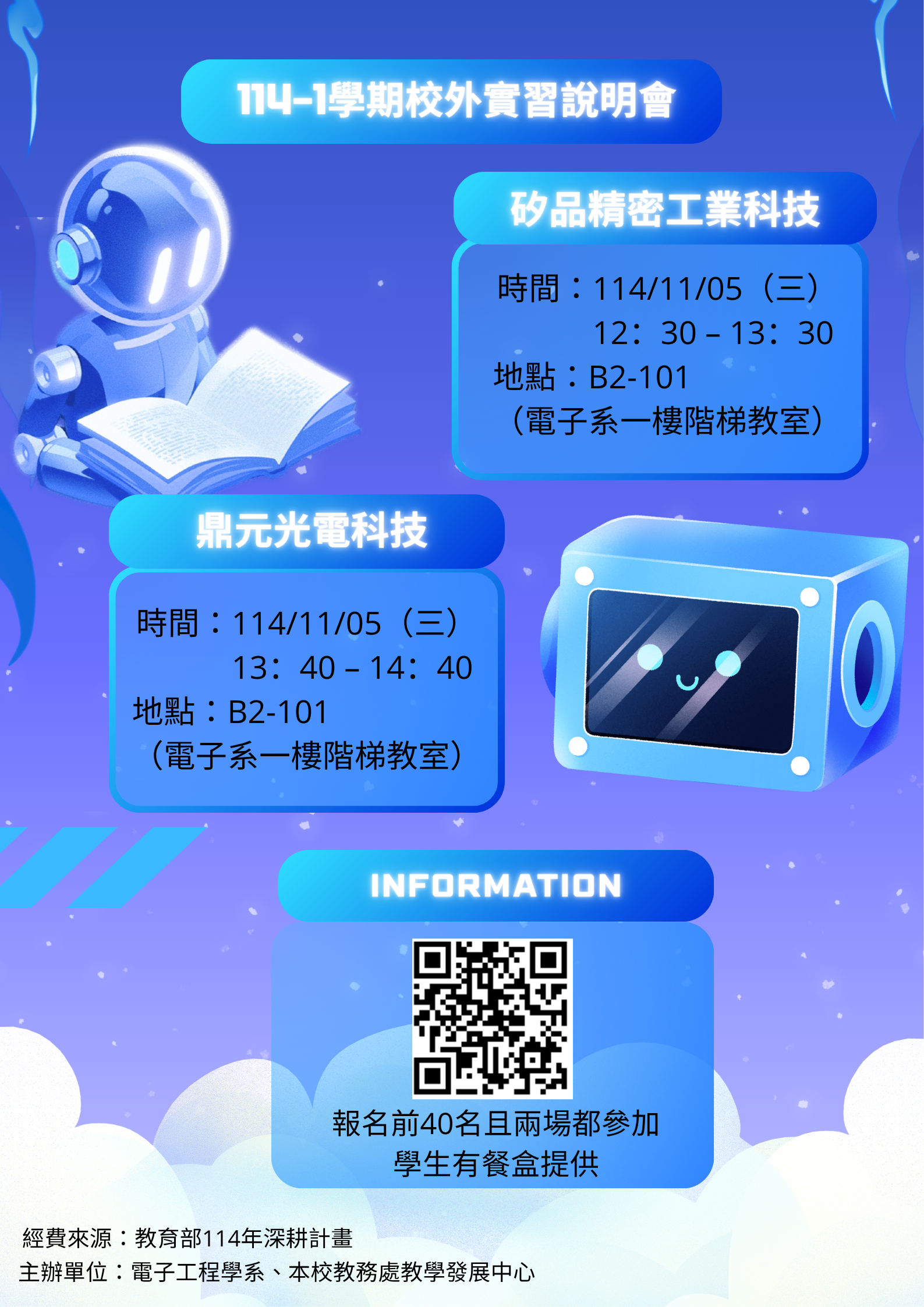【實習】矽品/鼎元(114-2學期)校外實習說明會(11/5舉行)